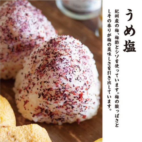 「うめ塩」は、紀州産の梅・梅酢・シソをブレンドし、梅の酸味と爽やかな香りを最大限に活かした一品です。