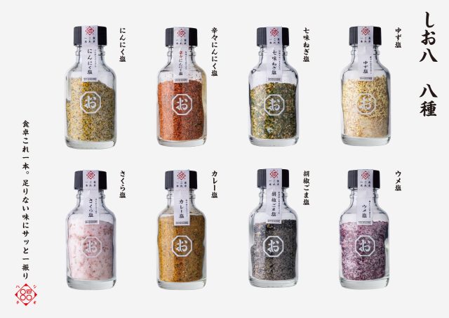 紀州産梅や梅酢とシソを使った「うめ塩」、爽やかな「ゆず塩」、桜の花や葉をブレンドした「さくら塩」、香ばしい「にんにく塩」など、自然の風味を生かした全8種類が揃います。