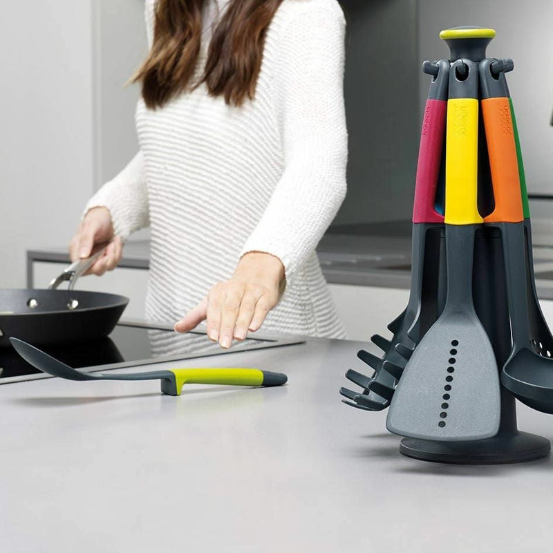 joseph joseph(ジョセフジョセフ)のエレベートカルーセルセットは、そんな悩みを解決するために作られました。回転式の収納台は上部のつまみを軽く回すことで簡単に取りたいキッチンツールが選べる仕様。スタンドに調理器具を収納でき、使いたい物を一瞬で見つけて取ることが出来ます。ガチャガチャと音をたてながら引き出しから探す必要も、ぎゅうぎゅうにつまった調理用具立てから引っ張り出す必要はもうありません。