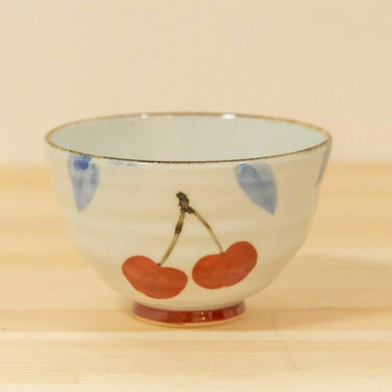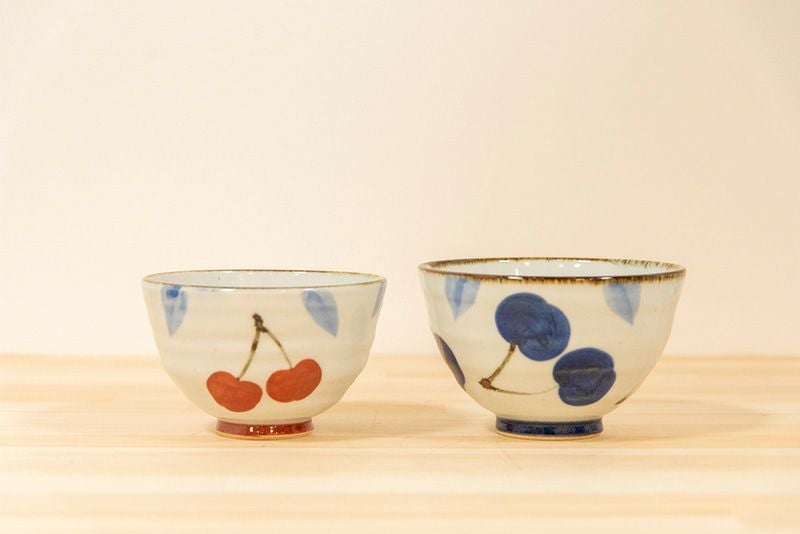 今回ご紹介する湯呑は、大小色違いのさくらんぼモチーフがアクセントの可愛らしいお茶碗。一つ一つ手描きなので少しずつ絵柄が違いますがそれもまた、味。