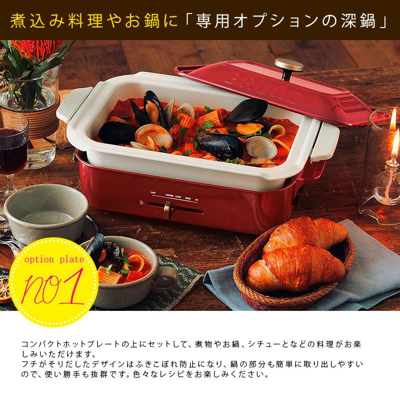 大人気のBRUNOのコンパクトホットプレートは、オプションが豊富なのが魅力です。オプションのセラミックコート鍋を使用することにより、ホットプレート付属のプレートでは作ることができなかった鍋料理や煮込み料理が愉しめます。