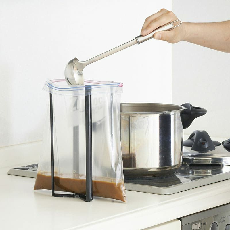 チャック付き保存袋を広げて使用すれば、食材をこぼさず移し替えることができます。 牛乳パックやペットボトルを乾かす時にも便利です。