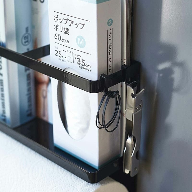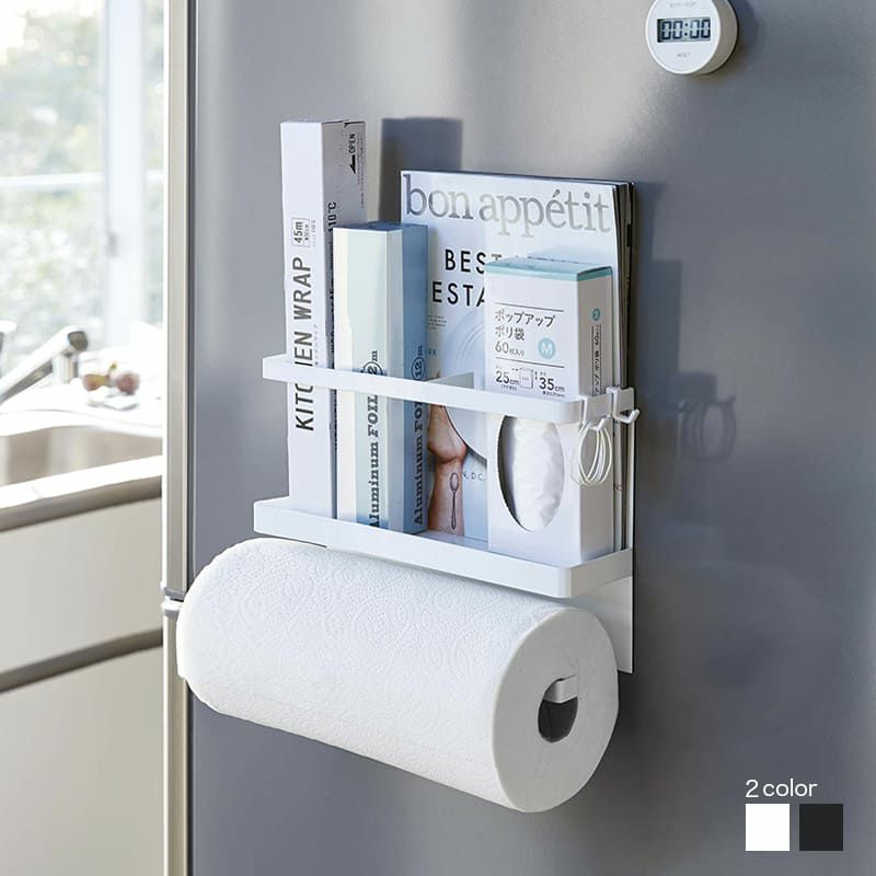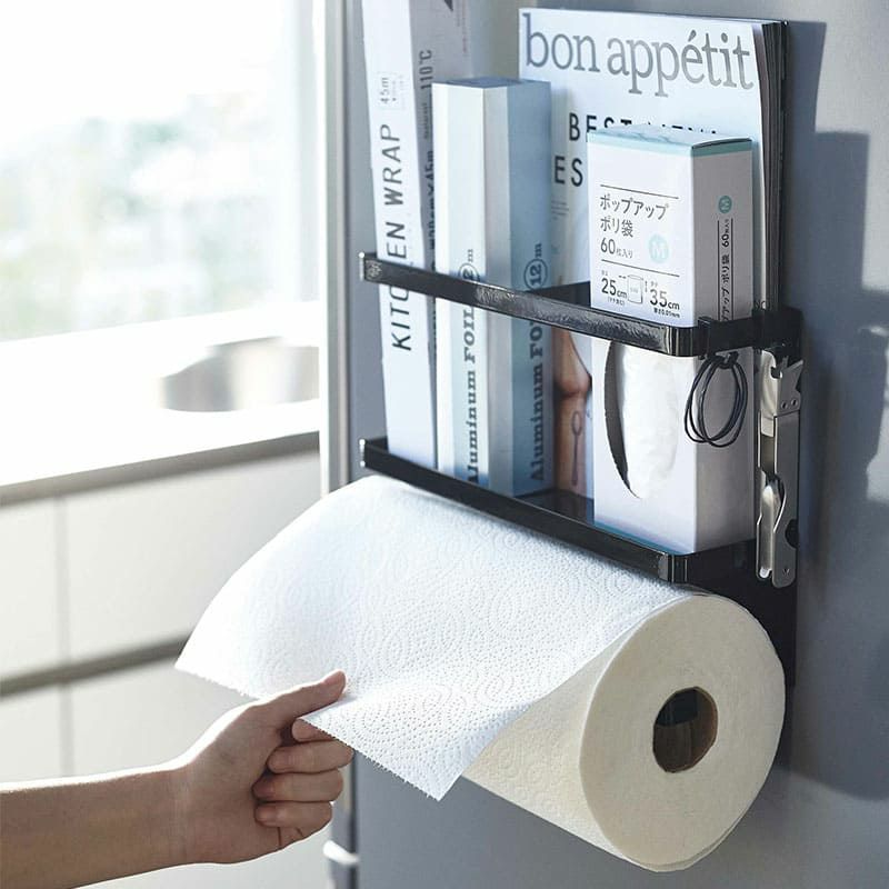冷蔵庫側面にマグネットで簡単取り付け。よく使うラップとキッチンペーパーを一括収納。大判タイプの海外製キッチンペーパーロールも収納できます。