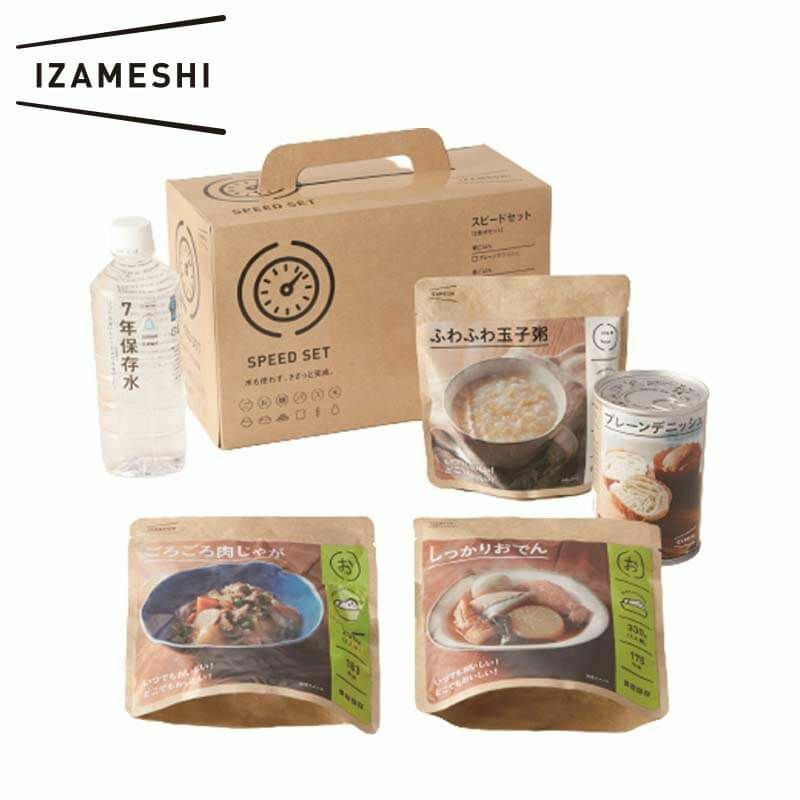 「いつでもおいしい!どこでもおいしい!」をコンセプトに、味にもパッケージにもこだわった新しい備蓄食「IZAMESHI」より、水を使わず封を開けるだけでお召し上がりいただける、非常時に最適なセット IZAMESHI/イザメシ スピードセット が登場しました。