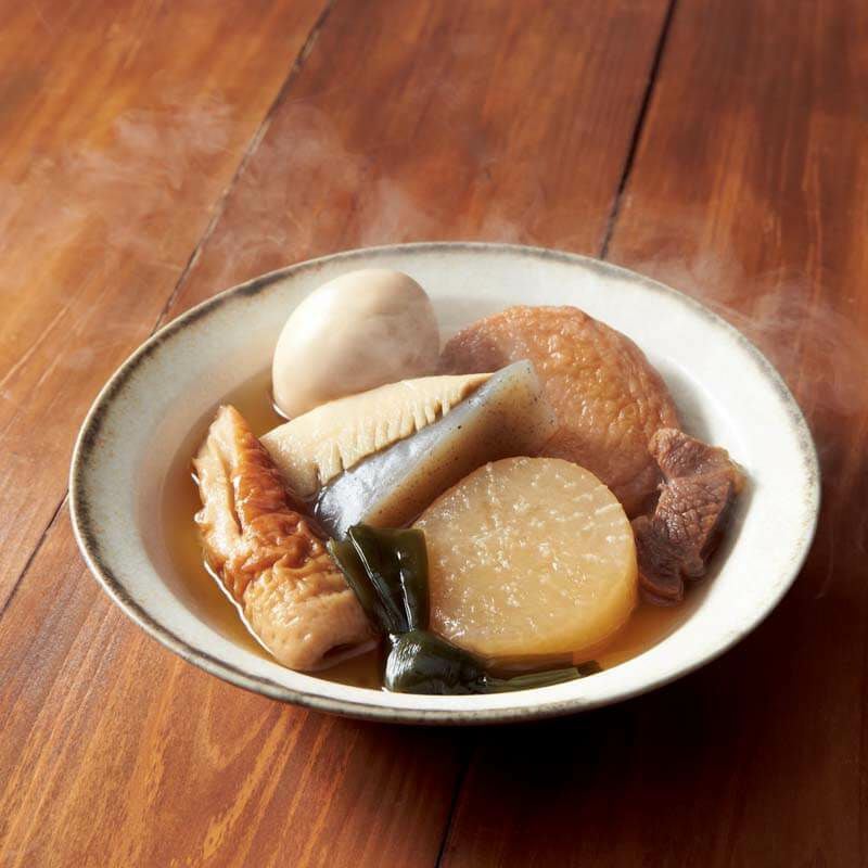 | 原材料名 | 水煮大根、ゆで玉子、大判揚げ、こんにゃく、 ちくわ、水煮たけのこ、牛すじ、結び昆布、 おでん汁の素(しょうゆ、食塩、 ぶどう糖果糖液糖、かつおエキス、煮干、野菜エキス、 たん白加水分解物、かつお節、さば節、昆布エキス)、 水あめ、かつおエキス/ソルビトール、 加工でんぷん、調味料(アミノ酸等)、水酸化Ca、 酸化防止剤(V.E)、V.C、 (一部に卵・小麦・牛肉・さば・大豆を含む) |