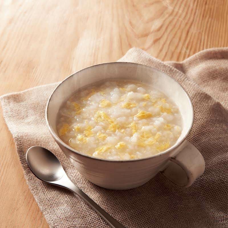 疲れた身体にやさしいお粥。ほんのりと香る玉子のお味と、口当たりの良いとろとろのお粥です。お子様やお年寄りも食べやすいひと品です。