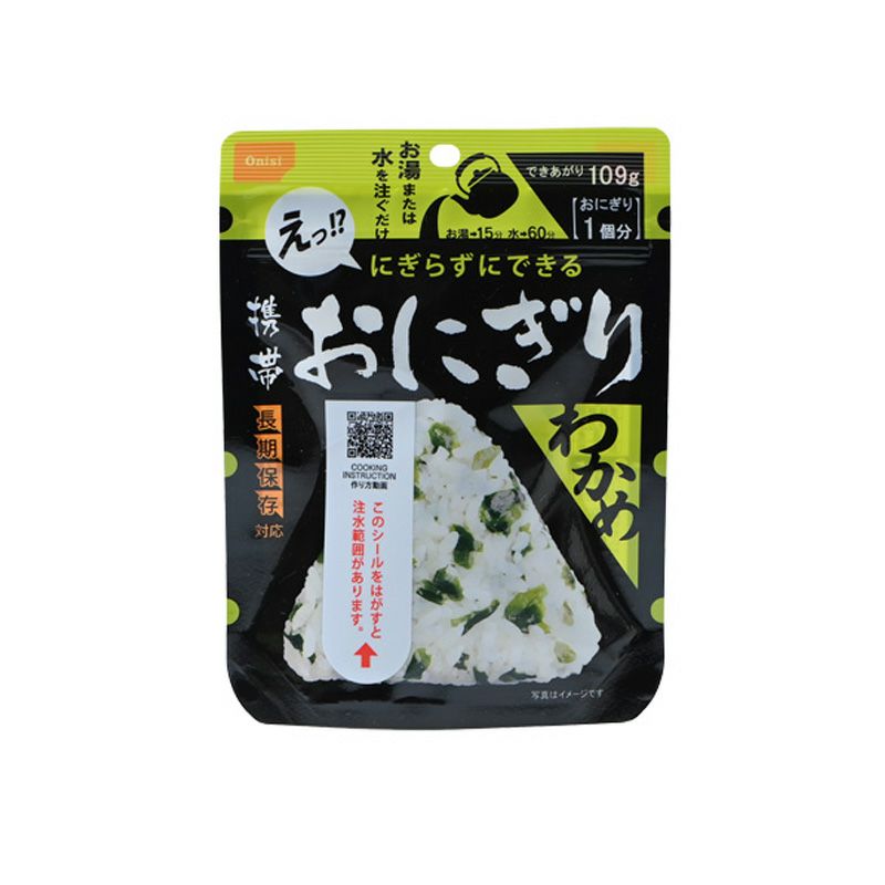 「携帯おにぎり」は、お湯や水を加えるだけで手作りのような美味しいおにぎりが作れる長期保存食です。100%国産米を使用し、品質と安全にこだわっています。具材の旨みがギュッと詰まっていて、食べるとほっとする味わいです。