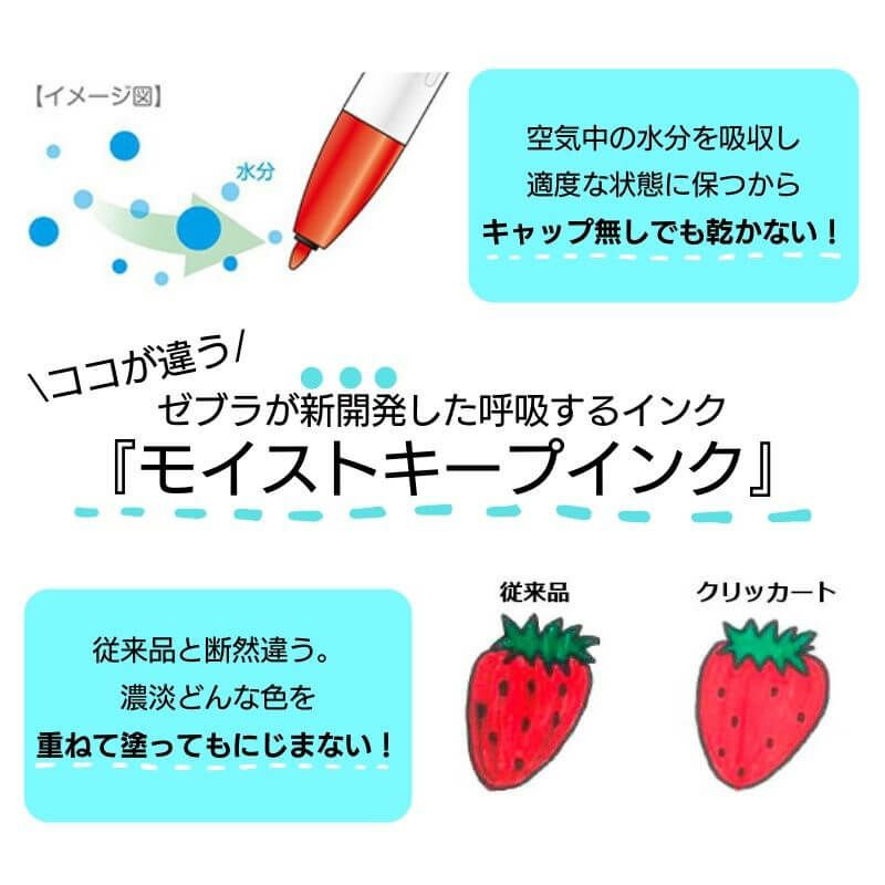 モイストキープインクとは、ゼブラが新開発した”まるで新呼吸をしているような”インク。空気中の水分を吸収し、かつ湿度の変化にも対応。水分の吸収と蒸発を繰り返し、適度な状態に保つのでペン先が乾きません。蒸発しにくい成分もプラスされています。